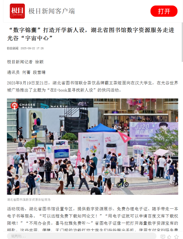 湖北省图书馆负责人介绍,省图自9月初启动开学季系列活动以来,策划了“跟着鄂图游湖北”“开学季在鄂图读好书”等活动。其中,与霸王茶姬开展深度合作,在地铁4号线开通数字阅读专列,于近20所高校周边门店设立数字阅读体验区,在极具人流量的武汉光谷和十堰大美商圈举办快闪活动,多账号联动在新媒体平台向大学生推介省图优质数字资源。湖北省图书馆正以更年轻、更潮流的姿态走近大学生群体,拓展公共数字文化服务形式,探索更多跨界合作与场景融合模式,提升公共文化服务的覆盖面和便捷性。