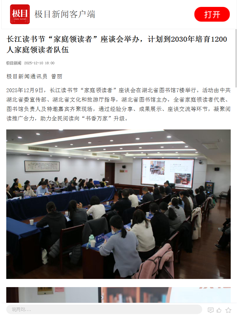 2025年12月9日,长江读书节“家庭领读者”座谈会在湖北省图书馆7楼举行。活动由中共湖北省委宣传部、湖北省文化和旅游厅指导,湖北省图书馆主办,全省家庭领读者代表、图书馆负责人及特邀嘉宾齐聚现场,通过经验分享、成果展示、座谈交流等环节,凝聚阅读推广合力,助力全民阅读向“书香万家”升级。