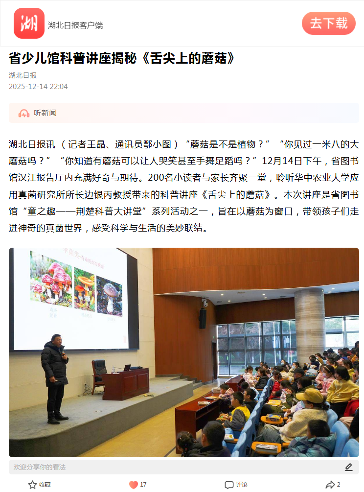 “蘑菇是不是植物?”“你见过一米八的大蘑菇吗?”“你知道有蘑菇可以让人哭笑甚至手舞足蹈吗?”12月14日下午,省图书馆汉江报告厅内充满好奇与期待。200名小读者与家长齐聚一堂,聆听华中农业大学应用真菌研究所所长边银丙教授带来的科普讲座《舌尖上的蘑菇》。本次讲座是省图书馆“童之趣——荆楚科普大讲堂”系列活动之一,旨在以蘑菇为窗口,带领孩子们走进神奇的真菌世界,感受科学与生活的美妙联结。