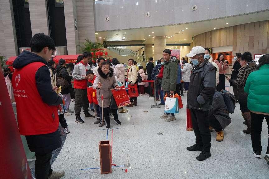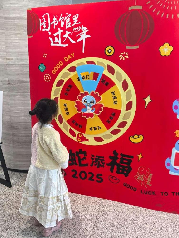启动仪式后,湖北省图书馆二楼热闹的“春韵赏年俗”小年年俗集吸引读者们纷纷前来打“书香年货”。“码上来接福”趣味大闯关区域,投壶挑战、新媒体话题互动、抽文创红包活动吸引了不少读者参与。现场还有“触摸雕版遗韵 吉祥年画送福”非遗体验,读者可以亲手制作“鱼跃龙门”“福禄寿喜娃娃”主题的年画作品。读者在“贯穿古今中外的多元化文献、融合书画数字的多样态资源、线上线下结合的多形态互动”中找寻年俗记忆。在一楼展厅,还有“书香墨韵”湖北迎春画展,展出湖北中国画名家的80余件作品。六楼楚天创阅空间设置“读来运转,转蛇添福”幸运大转盘,读者完成指定任务,即可通过转盘抽奖,获得相应礼物。1月22日至27日及2月1日至4日,读者均可参与幸运大转盘抽奖活动。